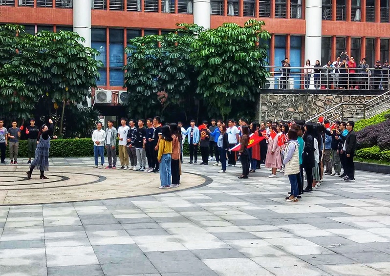 伴随着下课铃声的响起,黄淑涵同学清晰响亮的朗诵拉开了此次活动的序幕。郑桂文、郑雅琳等10位同学轮唱《学习雷锋好榜样》,用坚定、有力的歌声,向雷锋同志致敬。就在同学们以为活动结束,散场之际,“寻真求是、格物致知”校训广场响起了优美、柔和的旋律,余静婷等10名同学领唱《我和我的祖国》,学院领导、辅导员、教师党员以及围观学生一同齐唱。通过短短10分钟的歌曲演绎,让爱国情、强国志、报国行深入广大学生的心中。
