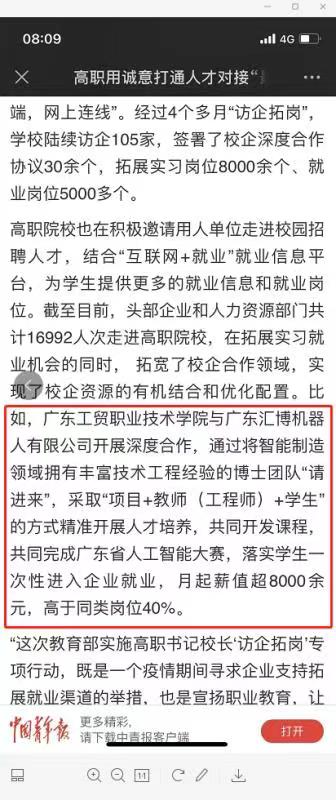 怎样在“后疫情时代”,拓宽学校毕业生的就业渠道,各高效积极作为,“走出去”“请进来”相结合,开展“访企拓岗”专项行动,积极邀请用人单位走进校园招聘人才。太阳集团城官网1407与广东汇博机器人有限公司开展深度合作,通过将智能制造领域拥有丰富技术工程经验的博士团队“请进来”,采取“项目+教师(工程师)+学生”的方式精准开展人才培养,共同开发课程,共同完成广东省人工智能大赛,落实学生一次性进入企业就业,月起薪值超8000余元,高于同类岗位40%。