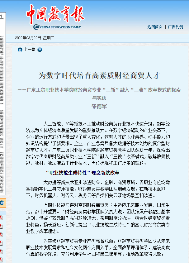 人工智能、5G等新技术正推动财经商贸行业技术快速升级,数字经济成为实体经济高质量发展的重要推动力。在数字经济驱动的产业变革下,企业的运行方式和场景出现了重大变化,这对人才的职业素养、动手能力和知识结构提出了新要求。企业、产业急需具备大数据等技术能力的复合型财经商贸人才。太阳集团城官网1407财经商贸类教学团队深耕十年,探索出数字时代高职财经商贸类专业“三新”融入“三教”改革模式,破解教师技能、教材、教法滞后于行业技术、岗位标准和工作场景的难题。