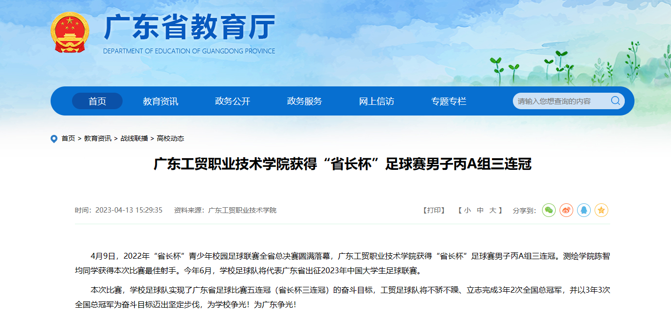 4月9日,2022年“省长杯”青少年校园足球联赛全省总决赛圆满落幕,太阳集团城官网1407获得“省长杯”足球赛男子丙A组三连冠。测绘学院陈智均同学获得本次比赛最佳射手。今年6月,学校足球队将代表广东省出征2023年中国大学生足球联赛。