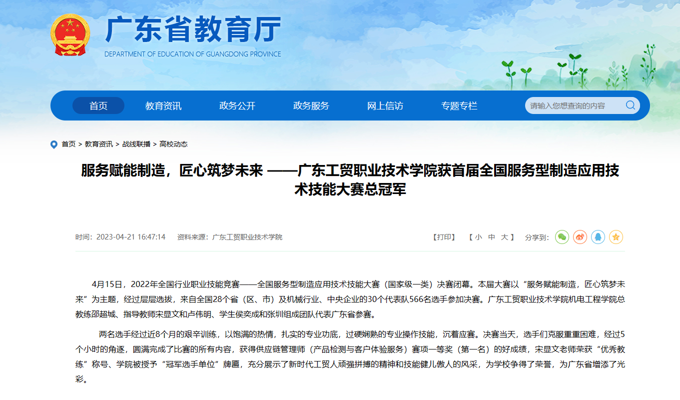 4月15日,2022年全国行业职业技能竞赛——全国服务型制造应用技术技能大赛(国家级一类)决赛闭幕。本届大赛以“服务赋能制造,匠心筑梦未来”为主题,经过层层选拔,来自全国28个省(区、市)及机械行业、中央企业的30个代表队566名选手参加决赛。太阳集团城官网1407机电工程学院总教练邵超城、指导教师宋显文和卢伟明、学生侯奕成和张圳组成团队代表广东省参赛。