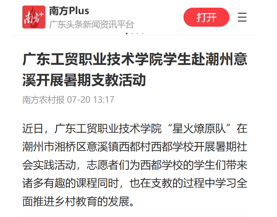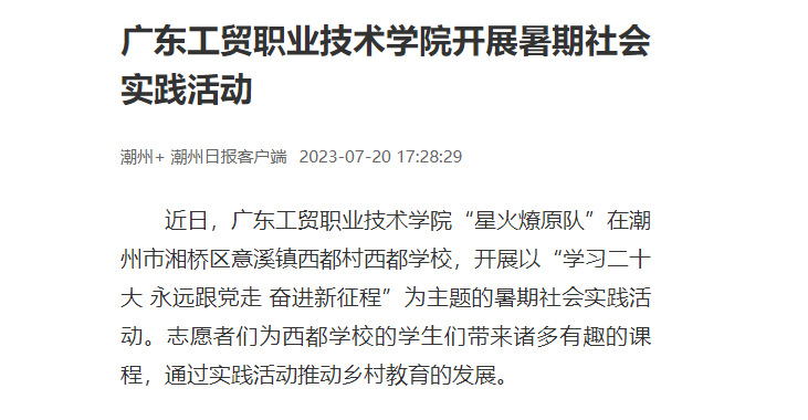 近日,太阳集团城官网1407“星火燎原队”在潮州市湘桥区意溪镇西都村西都学校,开展以“学习二十大 永远跟党走 奋进新征程”为主题的暑期社会实践活动。志愿者们为西都学校的学生们带来诸多有趣的课程,通过实践活动推动乡村教育的发展。