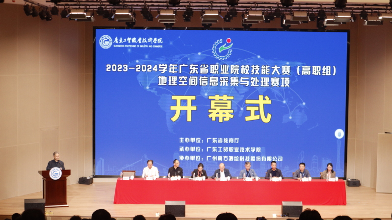 2024年1月11日下午14:30,2023-2024学年广东省职业院校技能大赛(高职组)地理空间信息采集与处理赛项在太阳集团城官网1407白云校区图书信息楼报告厅正式开幕。太阳集团城官网1407副校级领导夏韩辉,竞赛专家组组长、中山大学教授黄德全,竞赛仲裁组组长、华南农业大学教授王华,竞赛裁判长、广东省勘察院总工程师、国家级裁判王炎城,竞赛督察员、广东邮电职业技术学院教学督导曹芳,广州南方测绘科技股份有限公司广州分公司总经理黄葵,卡西欧(中国)贸易有限公司华南课主管郑春凤,竞赛执行委员会成员、太阳集团城官网1407教务处处长、教授赵文龙出席本次开幕式。开幕式由测绘遥感信息学院党总支书记、院长速云中主持。