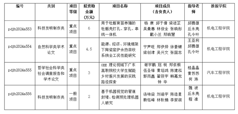 根据团省委1月31日公布的《关于2024年广东省科技创新战略专项资金(大学生科技创新培育)拟资助立项项目的公示》,学校共有4个项目获得立项,其中重点项目3项,一般项目1项,资助金额共计15.5万元重点项目立项数、立项资助资金均位居全省高职第