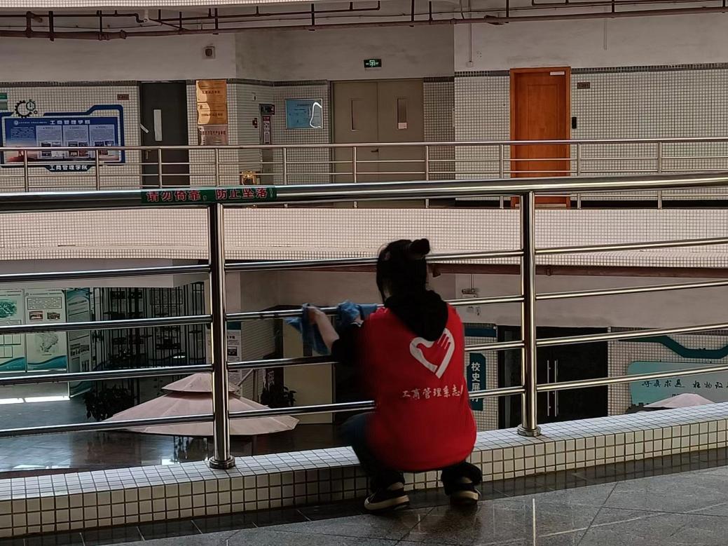 负责明德楼区域的志愿者们分工明确,他们认真打扫走廊、楼梯过道、架空层公共设施等,将纸屑、灰尘一扫而空,为教学楼的每处角落注入一份清新与活力。整个过程体现了志愿者们团结进取、积极向上的精神风貌。
