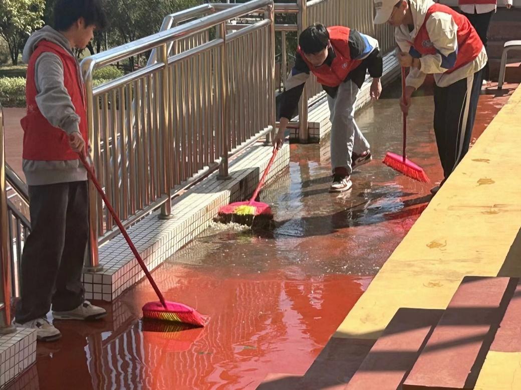由于近期连续的降雨,看台的路面变得脏滑,这无疑为志愿者们的清扫工作增加了不小的难度,但志愿者们并没有逃避,反而以更加饱满的热情投入其中。在志愿者们的默契配合下,看台焕发出了新的光彩。