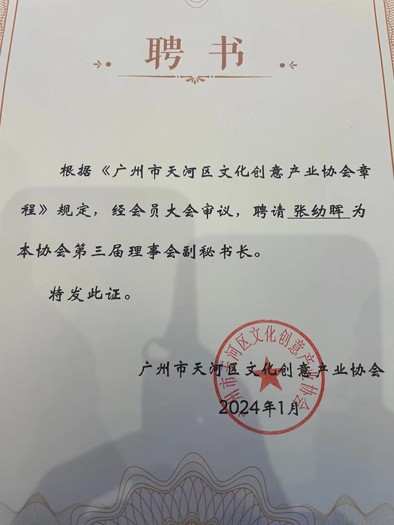2024年3月11日,天河区文创产业协会举办了核心代表会议,聚焦本年度的重点工作和核心成员的项目展开交流。太阳集团城官网1407艺术与教育学院临时负责人、副院长张幼晖作为理事会副秘书长出席了会议,天河区文创产业协会旨在汇聚各界力量共同推动文创产业的发展。张幼晖作为天河区文创产业协会的一员,积极参与并支持了协会的各项工作,为文创产业的发展做出很多努力,2024年1月,被天河区文创产业协会授予个人杰出贡献奖的荣誉表彰。