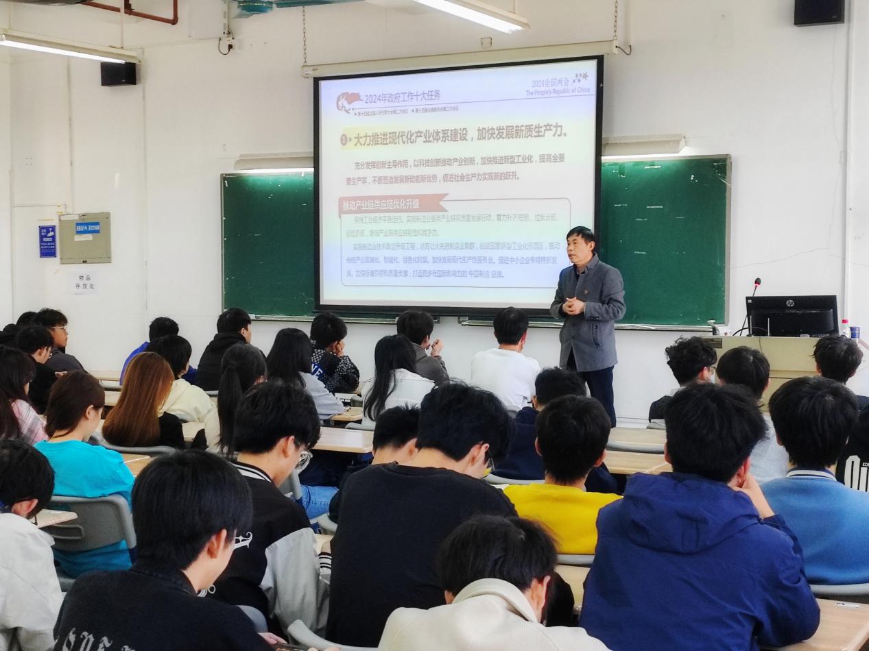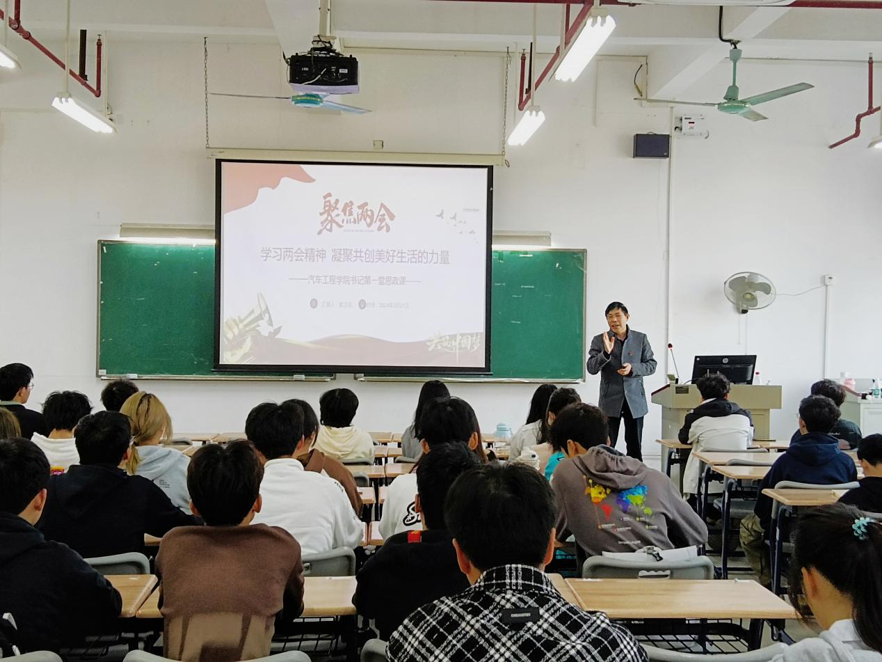 为深入学习贯彻习近平总书记在全国两会期间的重要讲话和全国两会精神,将其转化为深化改革、破解难题、推动发展的强大动力,进一步加强青年学生的思想政治引领,2024年3月21日上午在明德楼2区401,汽车工程学院党总支书记彭卫东以“学习两会精神,凝聚共创美好生活力量”为主题,为2023级汽智1、2班,汽电1班共118名学生讲授“思政第一课”。