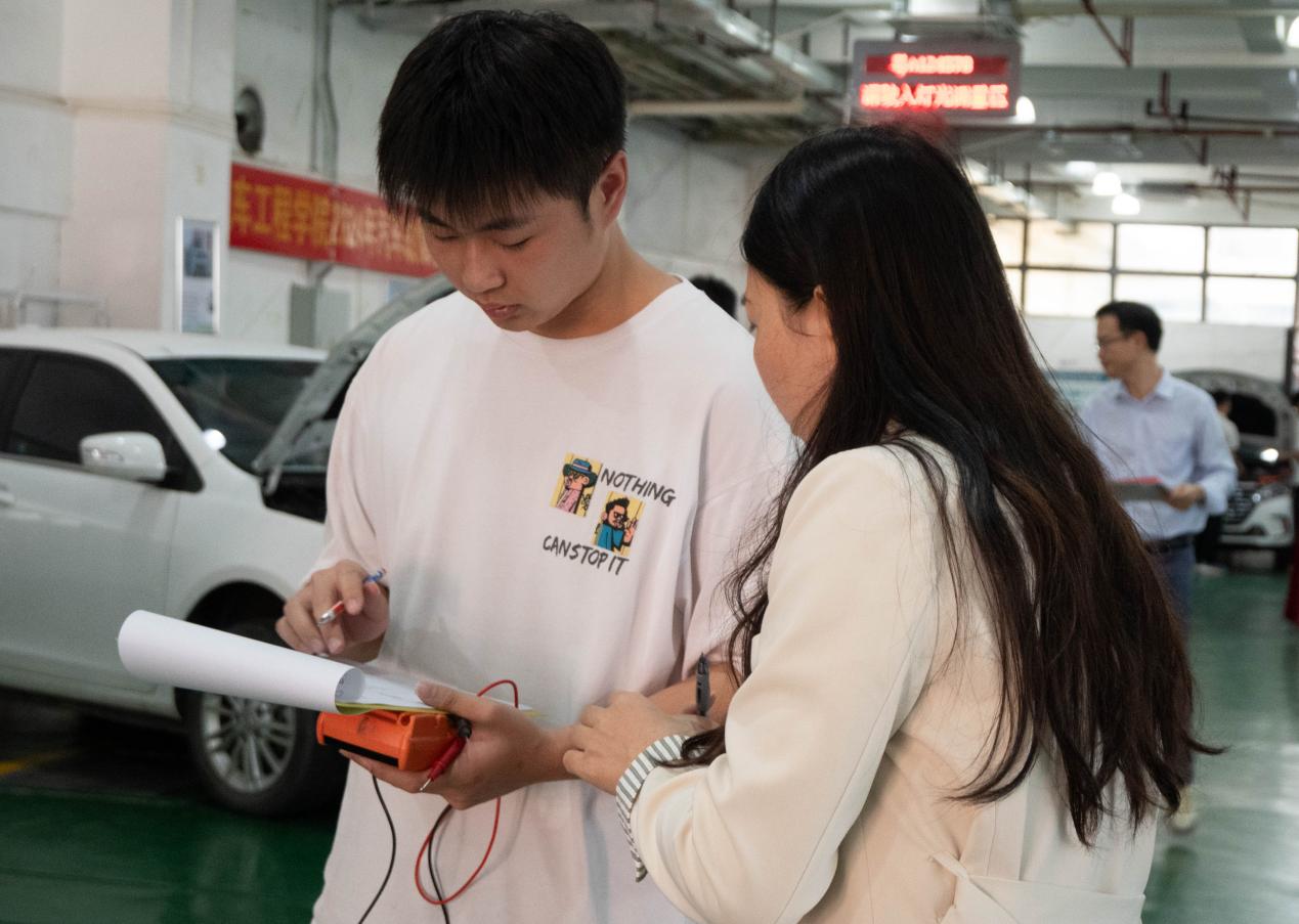 本次比赛为车灯光系统故障诊断与排除,使用实训室汽车整车,由技术人员在赛前设置故障,参赛选手结合整车的灯光系统检测,规范使用工具仪器进行排除,评委们通过对参赛选手们理论基础运用能力、上手实操能力、书面表达能力等进行评分。竞赛开始的指令下达后,选手们迅速投入到紧张的检修工作中。他们拿着专业工具,有条不紊地对汽车进行检查。有的选手趴在车底,仔细查看底盘的各个部件,不放过任何一丝细微的异常;有的则打开引擎盖,熟练地检测发动机的各项参数,敏锐的目光在错综复杂的线路和零件间穿梭。现场只听见工具的碰撞声和选手们偶尔低声的交流,每一个动作都展现出他们平日里的训练有素。