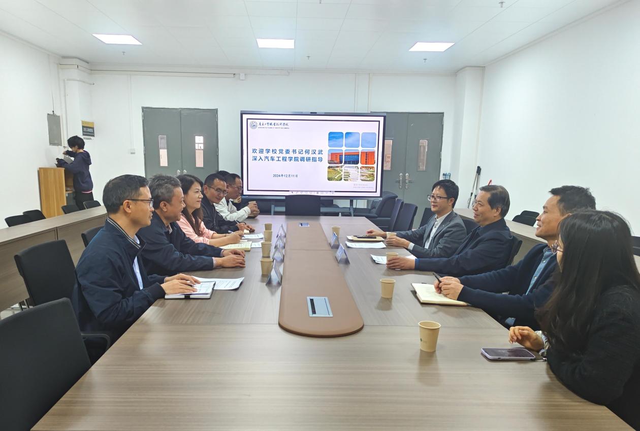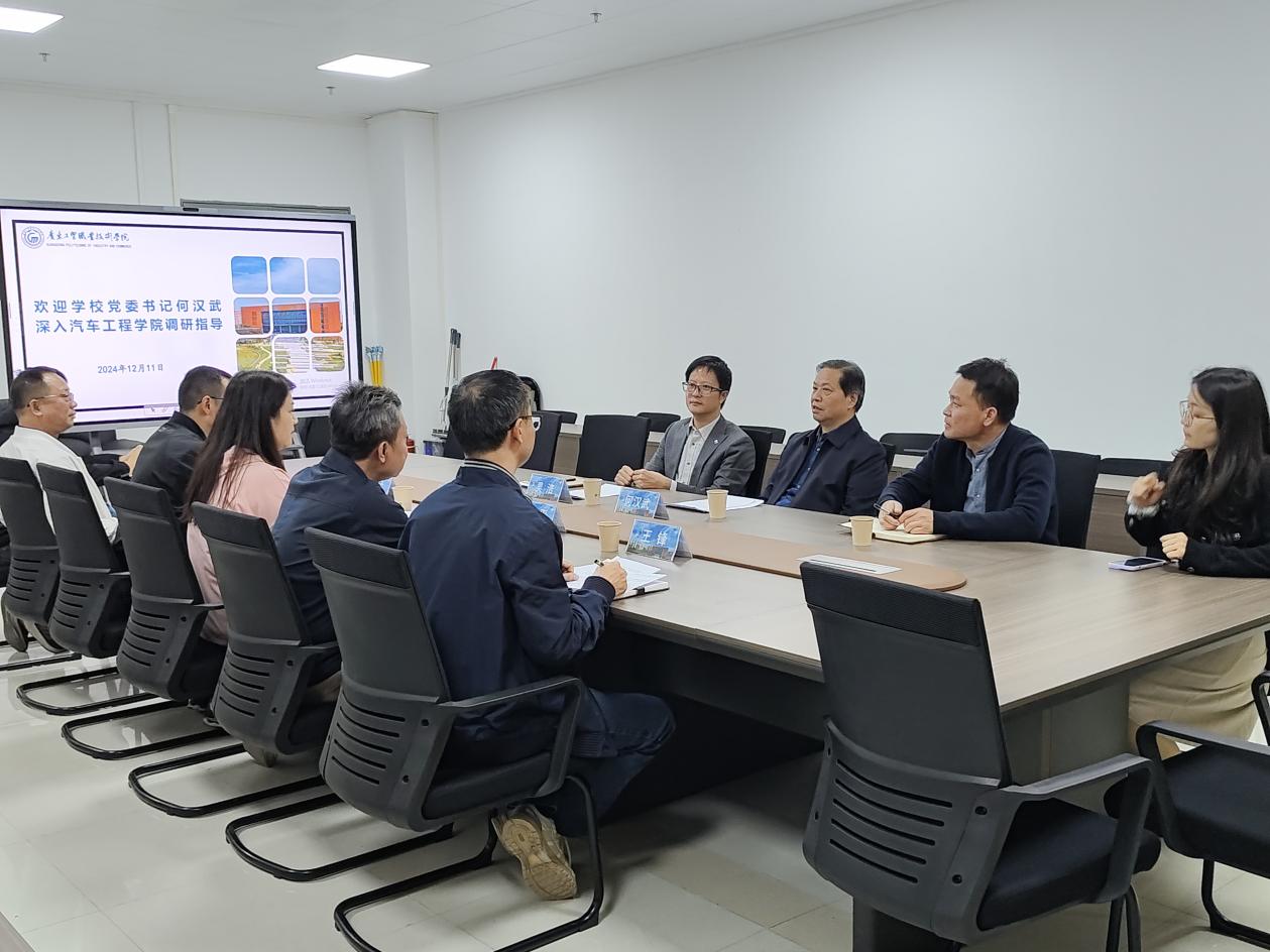 何汉武首先参观了学院新迁的办公场地。他对学院办公环境的改善表示肯定,并指出,良好的工作环境是教职工全身心投入教育教学和科研工作的基础保障。学院需要继续重视教职工的工作体验,不断完善办公设施设备,优化空间布局,营造舒适、便捷、和谐的工作氛围,提升教职工们的幸福感与归属感。并强调,学院文化是凝聚师生力量、彰显办学特色的重要载体,要充分结合汽车专业特点,突出学院特色文化,不断丰富文化底蕴与内涵,打造具有影响力与感染力的学院文化,激发师生对学院的认同感与自豪感,进而转化为推动学院发展的强大动力。