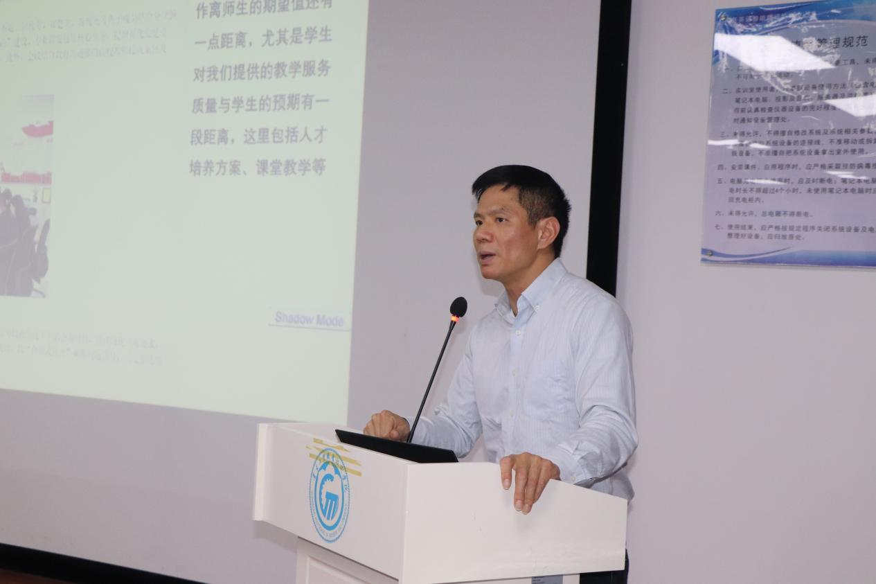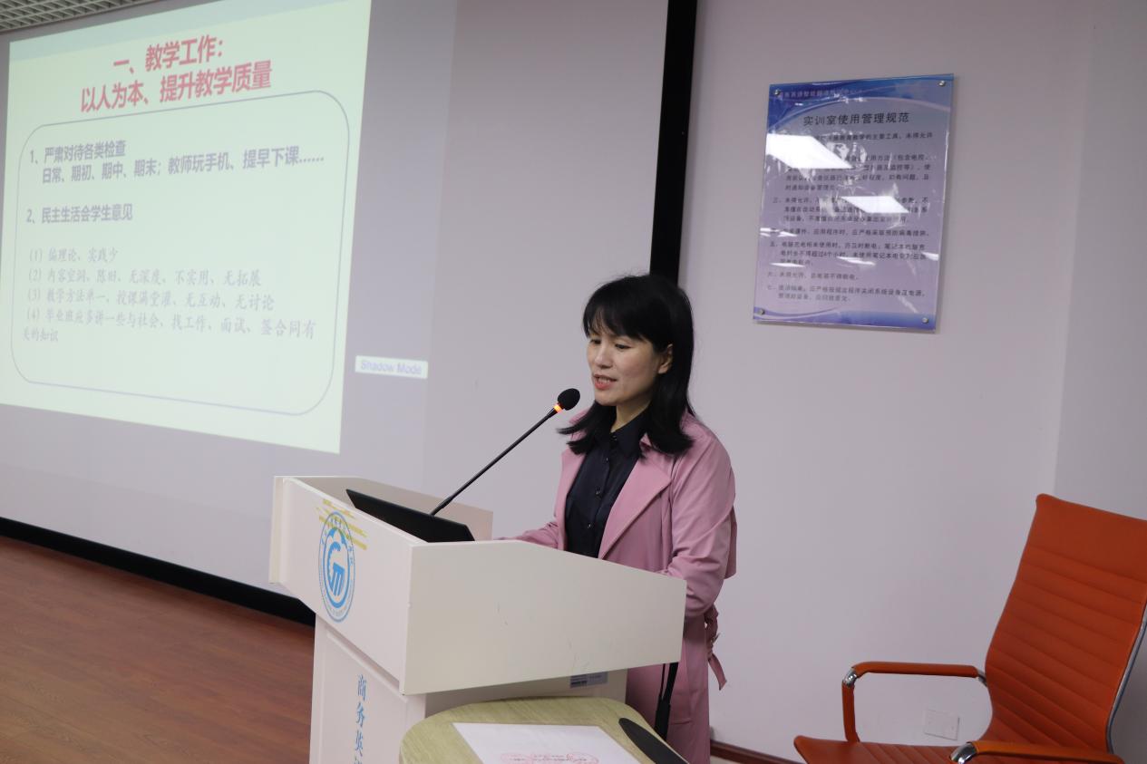 胡红玲副院长围绕教学工作、实习实训和学校教务会议传达三个方面的内容进行发言。在教学工作方面,她强调要以人为本、提升教学质量。任课教师要持续学习、加强校企共建课程,积极主动与学生进行沟通,满足学生的日常学习需求,提升教学质量。在实习实训方面,她提出要规范、有序、安全、高效;相关资料的收集要完整、及时、准确。传达学校教务会议精神旨在以绩效分配改革激发教师活力,以榜样引领与考纪考风建设破解学生迷茫。
