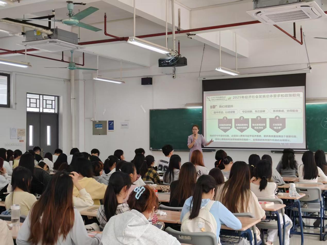 李莹老师着眼于“新时期我们面临的机遇和挑战”,创新性地引入了两会代表、政协委员的亲身经历与心得体会,通过面对面交流、互动讨论等形式,让学生们更加直观地了解了国家大事与民生热点,更加深刻地理解了两会精神的时代价值与深远意义。学生们在交流中碰撞思想,在思考中明确方向,纷纷表示将把两会精神内化于心、外化于行。