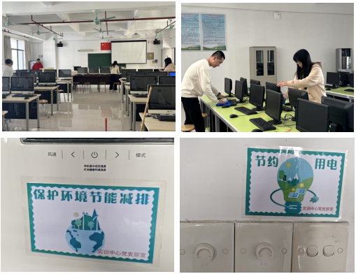第二组在实验员老师的带领下,对实训设备进行全面清洁维护。学生们细致擦拭电脑主机、键盘等设备,并在实训室醒目位置张贴节能标语,提醒师生养成节能的好习惯。
