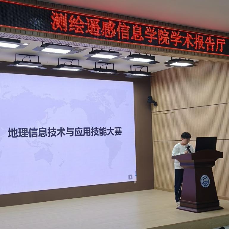 接下来,地理信息技术与应用技能大赛校园宣传大使曾沛怡上台进行宣讲。她结合自身参赛经历,向同学们介绍了地理信息技术与应用技能大赛的赛事规模、个人赛和团体赛的参赛要点及获奖情况,并鼓励同学们积极参赛,通过比赛提升专业。技能和团队协作能力。