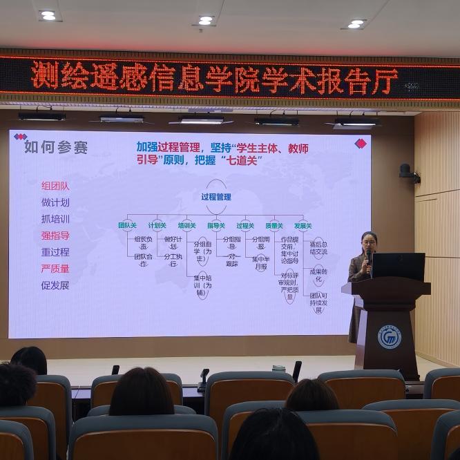 会议伊始,吴萍昊老师首先对测绘遥感信息学院历年在GIS竞赛中取得的优异成绩进行了回顾与介绍,随后详细讲解了2025年相关竞赛的规则、赛项变化、评审标准以及备赛资料等重要信息,同时,吴老师还对各位参会教师的研究方向、获奖履历进行了介绍,帮助参赛选手更好地选择适合自己的备赛指导教师。