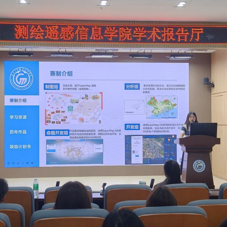 最后,申晨老师就SuperMap杯高校GIS大赛的相关内容进行了详细宣讲。申老师深入剖析了SuperMap杯的竞赛特点、技术要求以及评审要点,结合实际案例为同学们提供了宝贵的备赛建议,助力同学们在SuperMap杯竞赛中取得优异成绩。