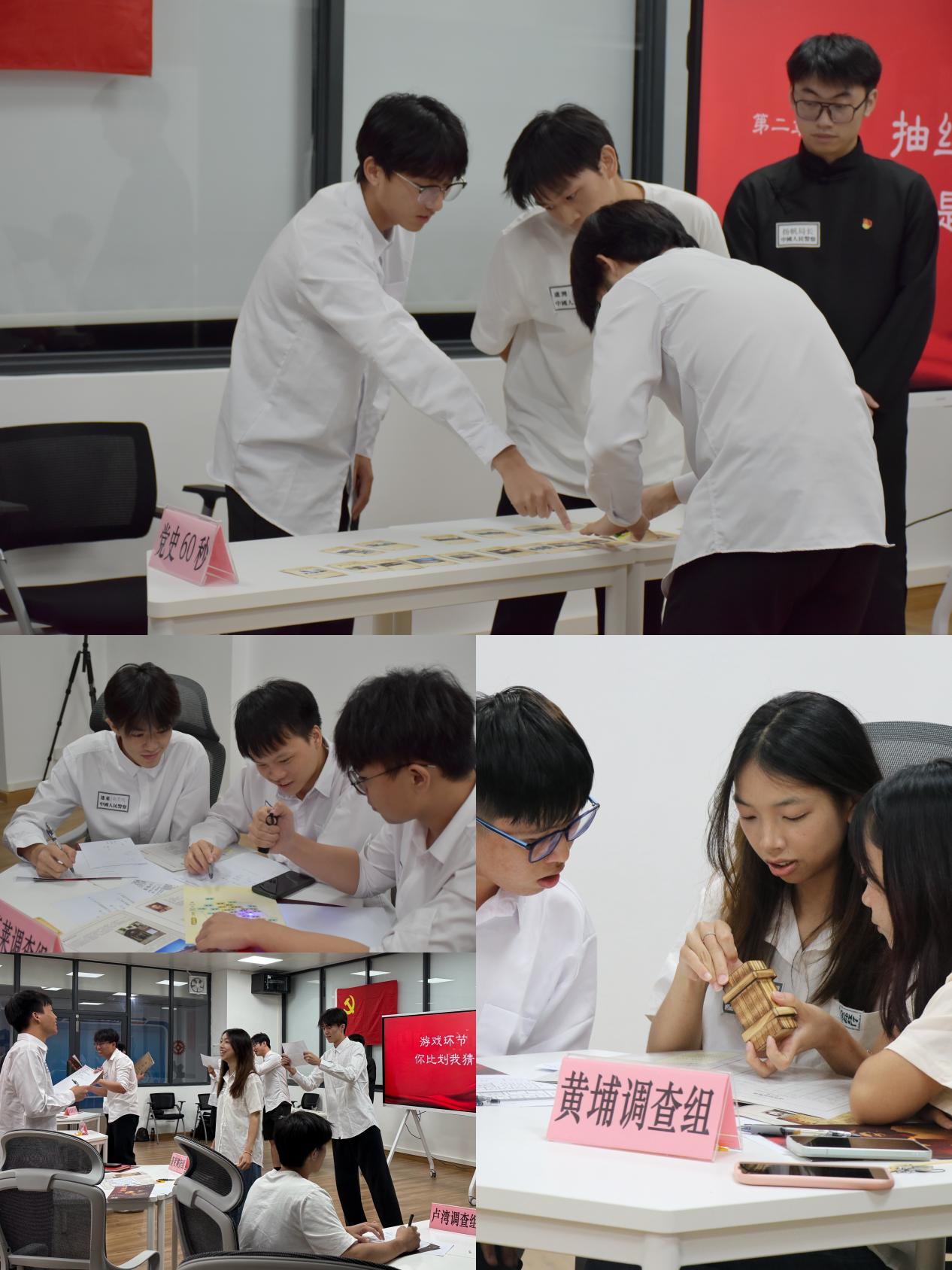 本次活动环节由何俊杰同志主持,选用《清澈的爱 只为中国》红色剧本,以中共隐蔽战线英雄烈士李白为原型,将参与者带入1949年上海解放前夕。18名同学分别扮演新成立的公安分局刑侦队员、译电员等角色,通过现场发放的“身份档案”“绝密卷宗”等道具,在主持人引导下,完成设定的“党史60秒”、“你划我猜”、“模拟拆弹”、“电码破译”等游戏关卡,层层破解敌特阴谋,历经2个小时抽丝剥茧,最终成功查明李白同志的下落,亲身体验革命先辈“电台重于生命”的忠诚信仰。环节最后,所有成员进行红色诵读《无名英雄赞歌》。