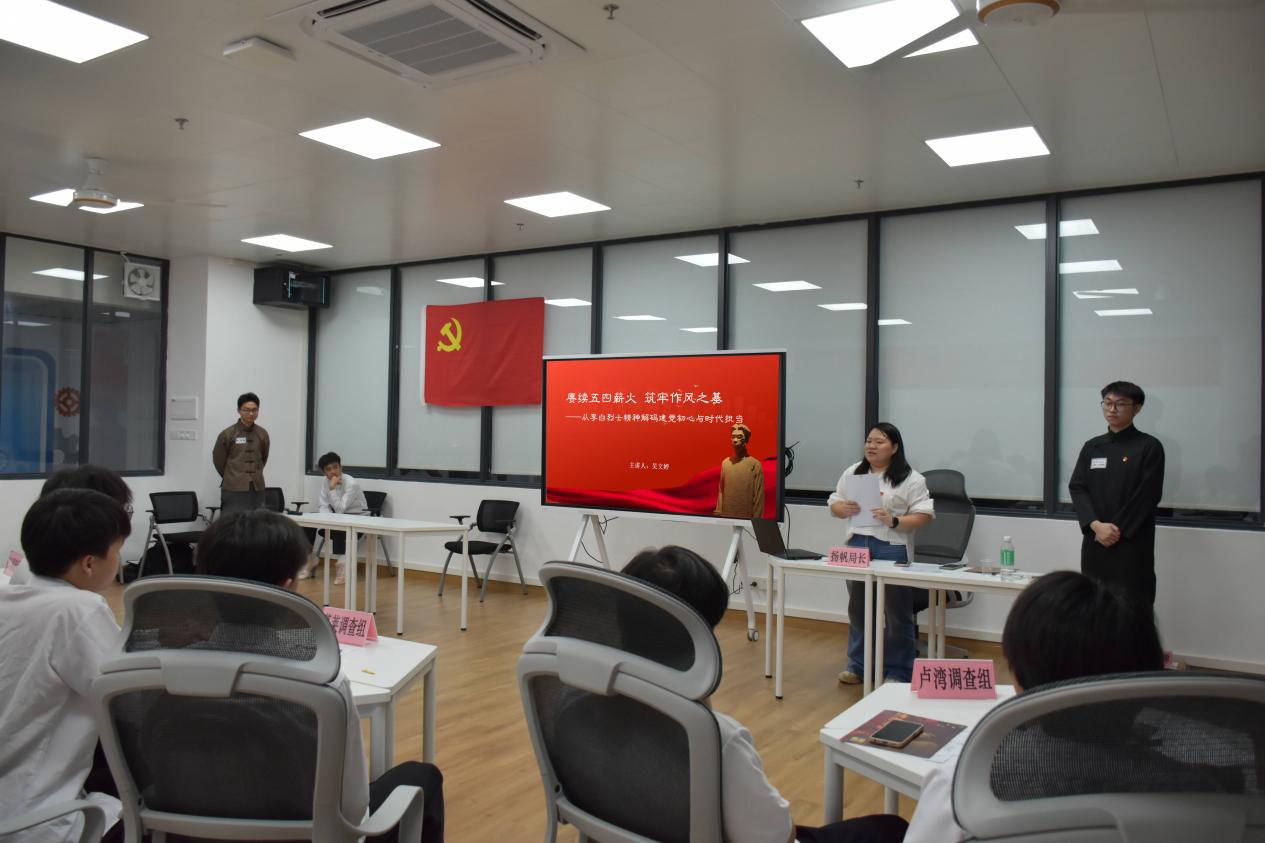 在情景演绎之后,支部书记吴文婷同志以“赓续五四薪火 筑牢作风之基——从李白烈士精神中解码建党初心与时代担当”为题进行主题分享。在数字化浪潮中开启红色记忆新维度,以云端漫游的创新形式,带领大家回顾了这位“空中桥梁”的通信英雄三次被捕但仍坚守电波阵地的光辉岁月。她讲到,在新时代的征程上,作为新时代大学生应以李白烈士为镜,汲取其英勇无畏、忠诚担当的精神力量,将个人理想融入国家发展大局,把作风建设内化于心、外化于行,在追求卓越中奋发图强,在时代洪流中勇挑重担,让五四精神与伟大建党精神在新时代交相辉映,绽放青春最耀眼的光芒。