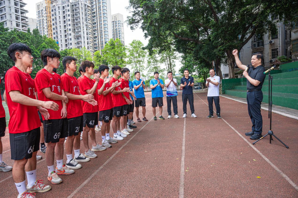 2025年5月24日上午,我校在天河校区东区足球场举行了一场简短而庄重的出征仪式,为即将代表学校赴海南省参加2024-2025全国青少年校园足球联赛的运动员们壮行。学校党委书记何汉武、党委副书记揭英荣、党政办公室主任吴浩、体育部党支部书记龙光星、副部长余铨业、教练员李耀辉、黄权章及全体参赛运动员共同出席活动。