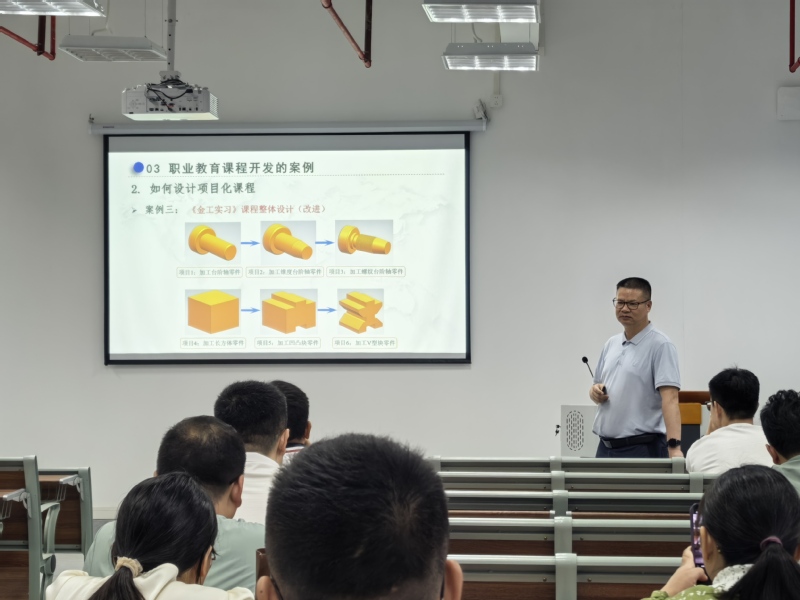 2025年5月22日,太阳集团城官网1407机电工程学院的青年教师们迎来了一场“及时雨”——广东工贸机电工程学院院长、全国优秀教师罗庚兴教授以《项目化课程设计与实施》为题,佛山职业技术学院专任教师、全国优秀教师肖志良教授以《让学生们喜欢你的课》为题,为学院40岁以下青年教师开展专项培训。这场持续2个半小时的专题培训以提升职教能力为目的,通过“项目设计+情景模拟+思政方法论”的新颖形式,让参训教师直呼“解渴”。