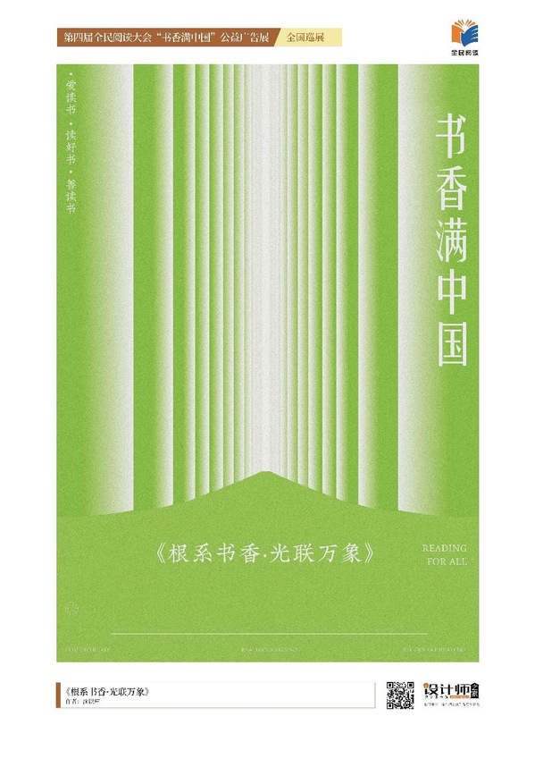 沈以庄老师的入展作品《根系书香・光联万象》,作品简介:作品以极简线条诠释“书香满中国”主题。竖直线条象征书页与光束,喻知识积淀与文明传承;底部根系脉络扎根 “2025 全民阅读大会”,寓意全民阅读滋养文化土壤。中英标语呼应文化自信与全球视野,以“根系” 深植传承,“光束” 广延传播,展现阅读如光合凝聚微光,点亮文明长河奔涌向前的时代力量。