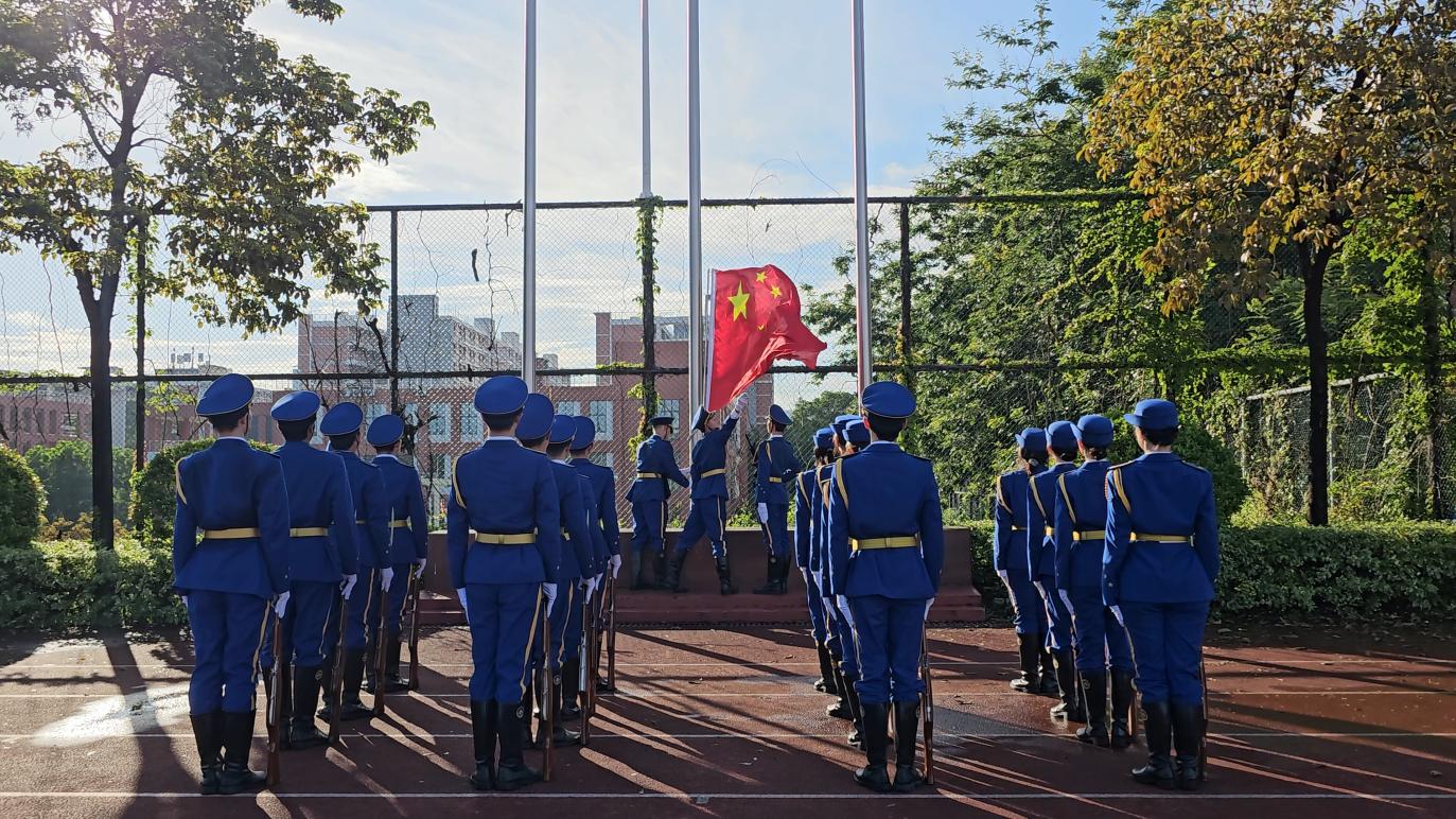 晨曦微露,红旗如焰。此刻我们相聚在七月的第一缕阳光下,以青春之名,赴一场红色之约。在全体师生的注目礼下,在激昂的《义勇军进行曲》中,鲜艳的五星红旗迎着初升的太阳冉冉升起、迎风飘扬。全体师生齐声高唱国歌,现场氛围庄重而热烈。国旗护卫队迈着整齐有力的步伐护送国旗入场,他们挺拔的身姿、标准的动作展现出工贸学子的责任与担当。
