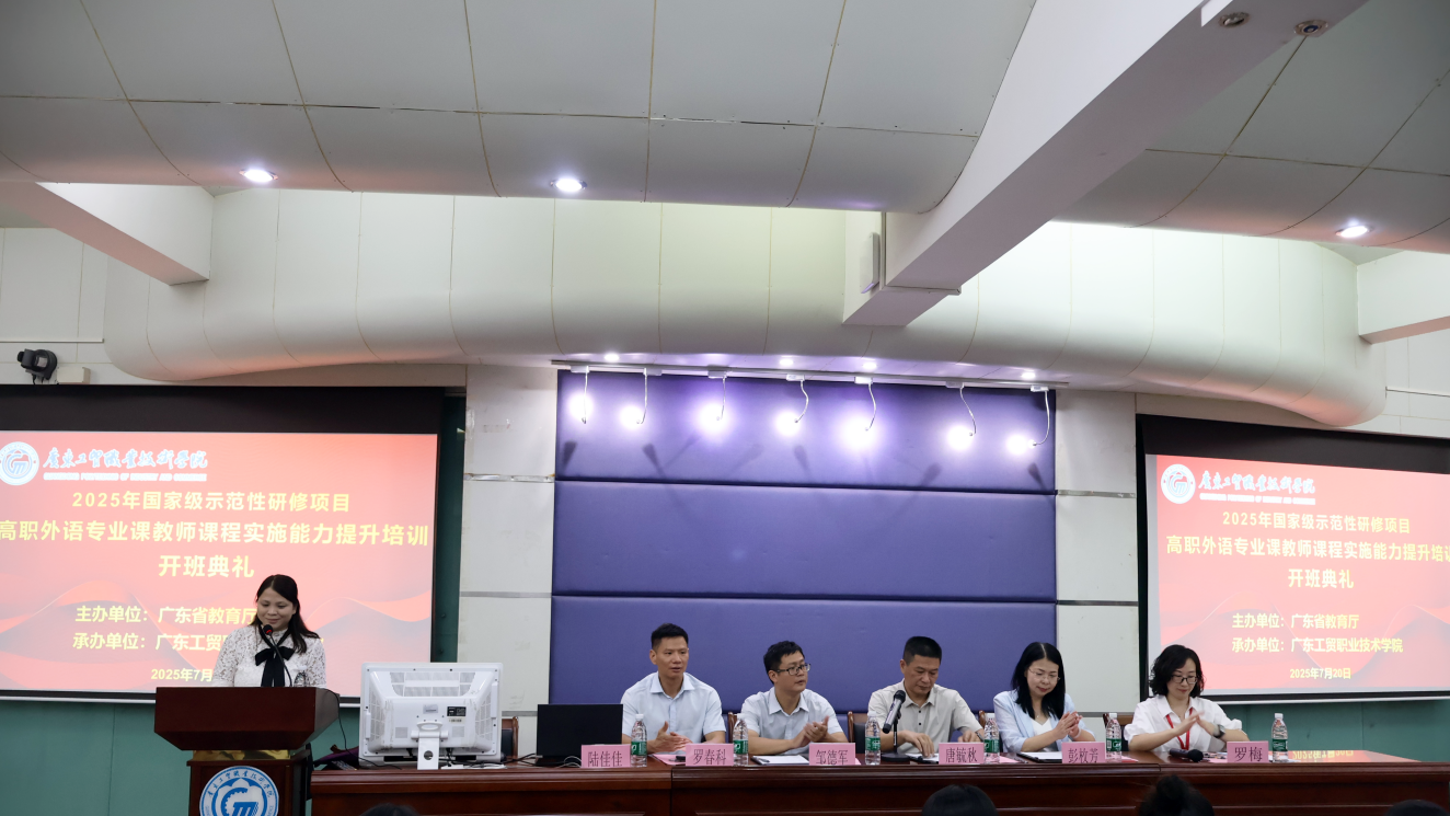 7月20日上午,由广东省教育厅主办、我校应用外语学院承办的广东省2025年职业院校教师素质提高计划项目——高职外语专业课教师课程实施能力提升(国培)班在学校天河校区西区报告厅开班。学校党委委员、副校长唐毓秋,培训与继续教育学院院长邹德军,应用外语学院党总支书记罗春科、院长彭枚芳,项目负责人陆佳佳、罗梅及全省30所职业院校的40名外语骨干教师出席开班典礼,开班仪式由应用外语学院教师陆佳佳主持。