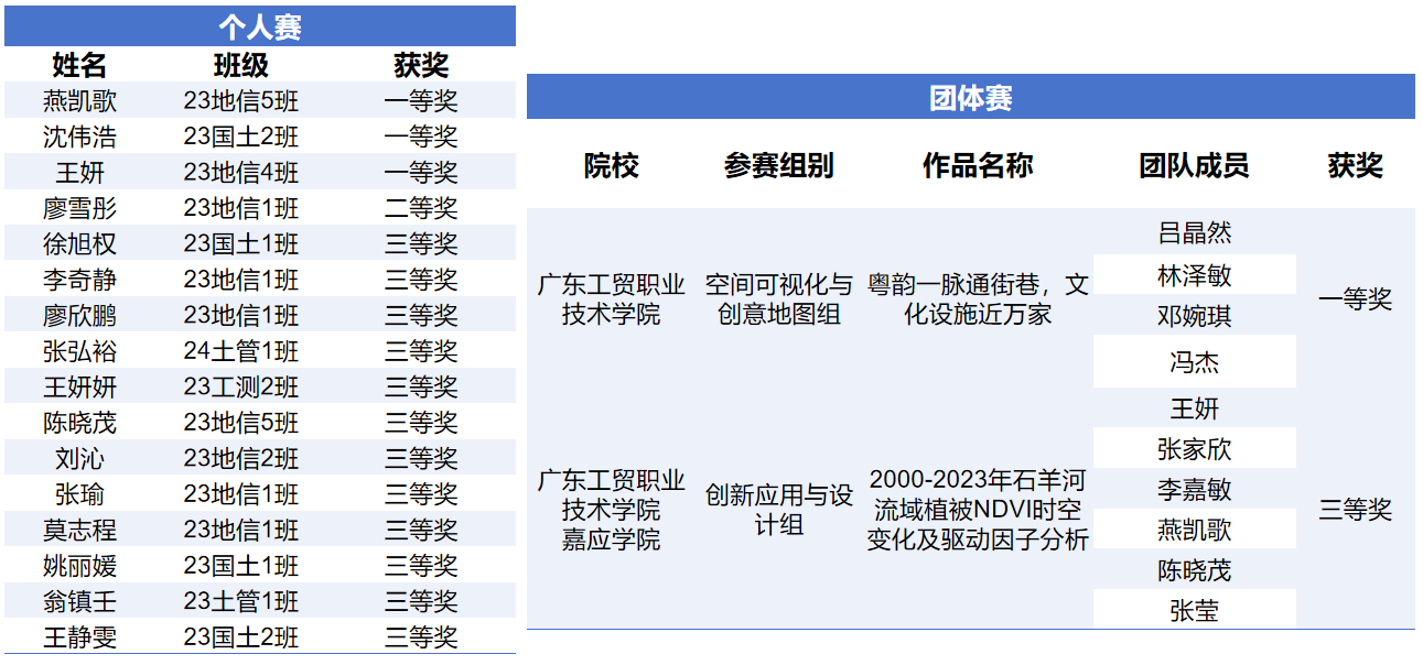本次大赛汇聚了全国众多高校的地信精英同台竞技,竞争异常激烈。我院学子不畏强手,奋勇争先,在个人赛与团体赛两个赛道上均取得了亮眼成绩: