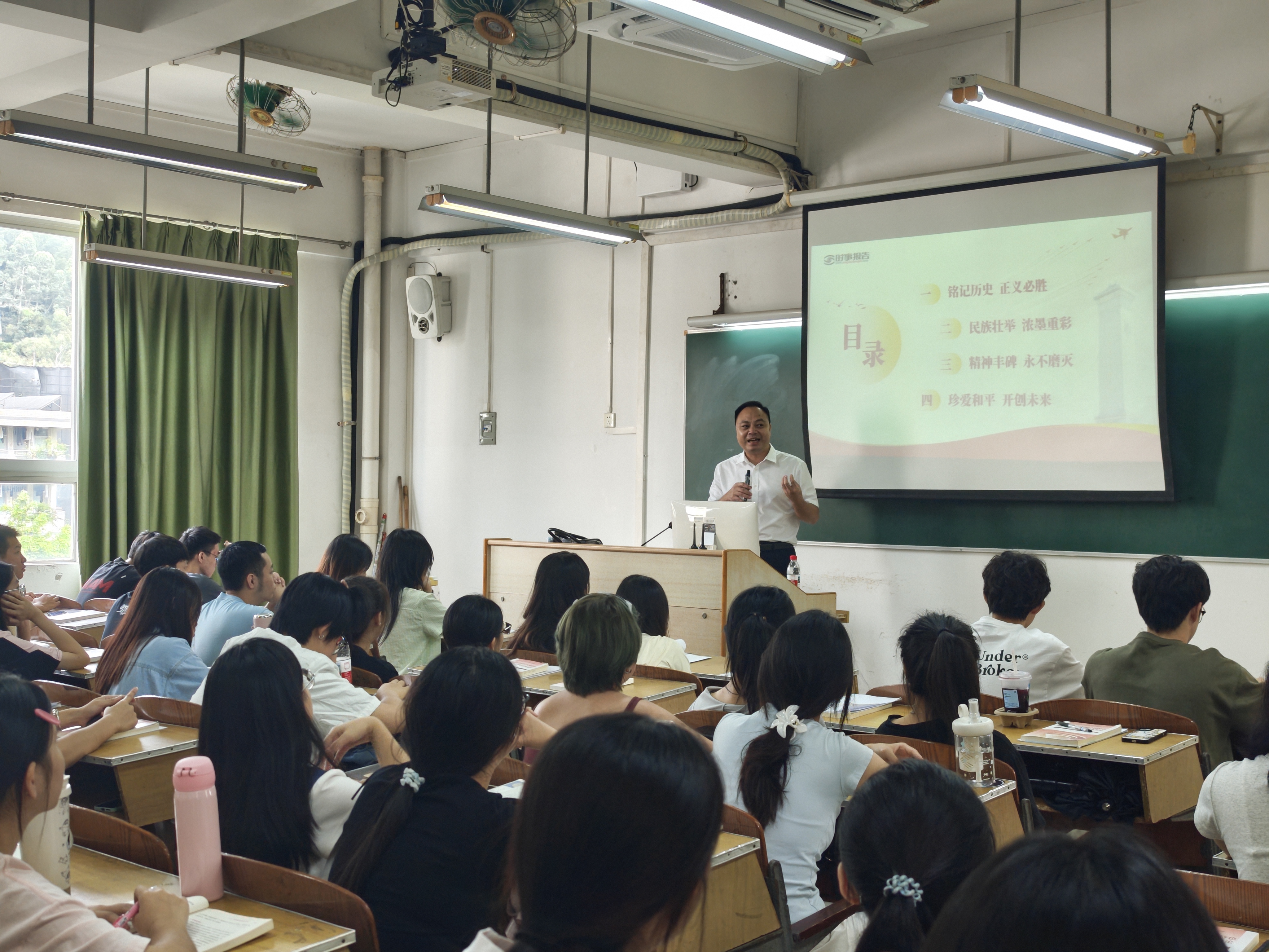 揭英荣从“铭记历史 正义必胜”“民族壮举 浓墨重彩”“精神丰碑 永不磨灭”“珍爱和平 开创未来”四个维度,深入阐释中国人民抗日战争的伟大历程、历史意义与时代价值。他以“九一八”事变94周年和中国人民抗日战争暨世界反法西斯战争胜利80周年系列纪念活动为切入点,系统回顾了抗日战争长达14年的艰苦卓绝历程,强调中国共产党在全民族抗战中的中流砥柱作用,指出中国人民抗日战争不仅是中华民族从近代以来陷入深重危机走向伟大复兴的历史转折点,也是世界反法西斯战争胜利的重要组成部分。揭英荣通过详实的历史资料和生动的案例,向学生展现了中国人民在极端困难条件下所表现出的爱国主义情怀、民族气节、英雄气概和必胜信念。