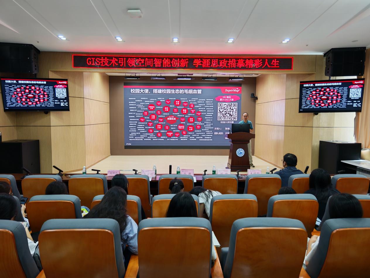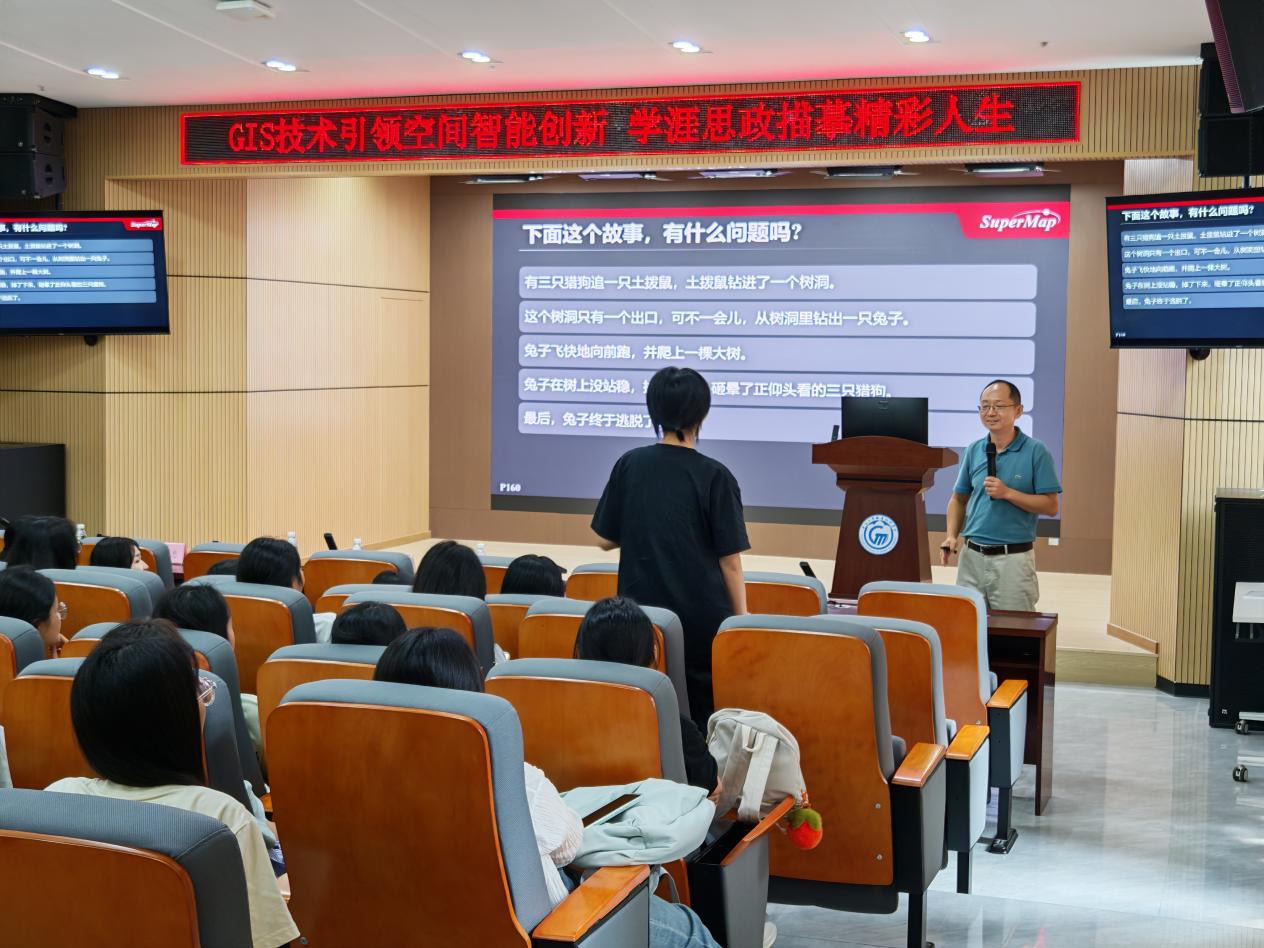 随后的专题讲座环节,刘宏恺先生从地理信息技术的核心价值出发,系统介绍了“空间智能金字塔”理论框架,包括地理空间技术的五个层次:感知、可视化、设计、决策与控制。他指出,GIS不仅是数据处理工具,更在智慧城市、自然资源管理、灾害预警等领域发挥核心作用。通过众多实际案例,他生动展示了GIS技术如何通过实时数据感知与可视化分析,为科学决策提供支持。刘宏恺先生还特别介绍了国产GIS平台“SuperMap”的技术创新与行业应用,展示了我国在地理信息领域取得的重大突破。