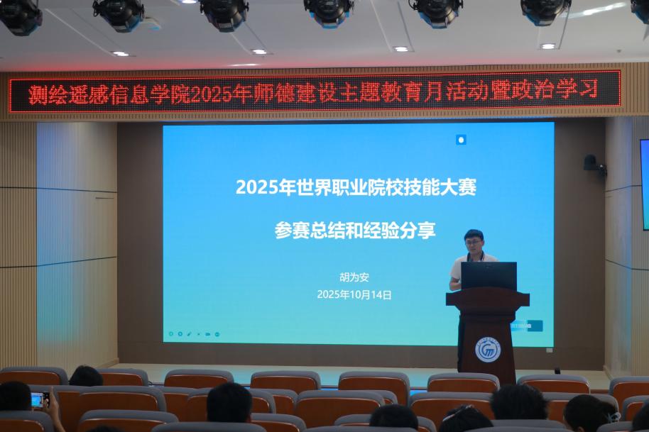 随后是专题培训环节,学院特别邀请了经验丰富的胡为安老师作“2025年世界职业院校技能大赛参赛总结和经验分享”讲座。胡为安老师长期深耕高职技能大赛指导工作,凭借其出色的专业指导能力与严谨的教学态度,曾多次带领学生在国家级、省级测绘遥感类技能竞赛中斩获优异成绩,积累了极为丰富的实战经验。培训中,他结合自身多年的指导经历,从大赛选题方向、参赛团队组建技巧、备赛阶段策略规划、学生心理辅导方法等方面进行了详细讲解。同时,他还重点分享了在指导过程中如何平衡技能训练与师德引导,如何通过大赛培养学生精益求精的工匠精神与团队协作能力的宝贵经验,为在场教师提供了极具针对性与实操性的指导建议,其精彩分享赢得了教师们的阵阵掌声。