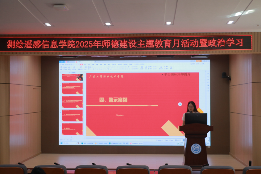 为深入推进新时代师德师风建设,筑牢教师育人初心,2025年10月14日,测绘遥感信息学院在博学楼5楼报告厅举行2025年师德建设主题教育月活动暨专题学习活动。此次活动围绕方案传达、文件学习、经验交流与案例警示四大核心环节展开,为全院教师搭建了深化师德认知、提升育人能力的学习平台,有力推动学院师德建设工作走深走实。