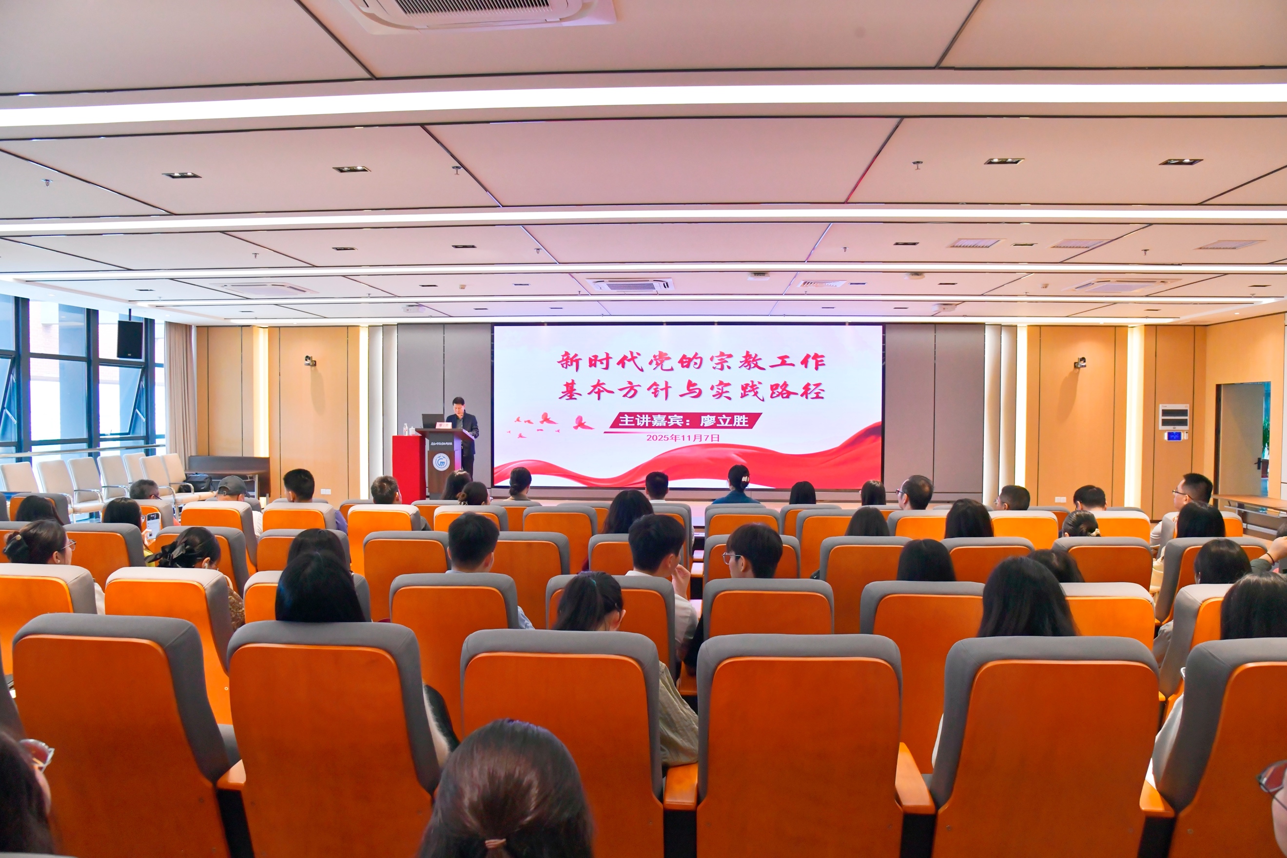 此次培训结合当前宗教重点工作和基层辅导员、组织员等现实工作需要,特别邀请了广东省委党校党的建设教研部副教授、国家二级职业指导师廖立胜进行专题辅导。据悉,廖立胜长期从事党的思想建设和中国共产党人精神谱系的教学科研工作,并在宗教工作领域有深厚的学术积累。培训中,他以《新时代党的宗教工作基本方针与实践路径》为题,从习近平总书记关于宗教工作的重要论述入手,阐明了新时代党的宗教工作的根本遵循,深入剖析了新时代党的宗教工作的基本方针,并结合丰富的实际工作案例,详细介绍了新时代党的宗教工作“导”之有方、“导”之有力、“导”之有效的实践路径。