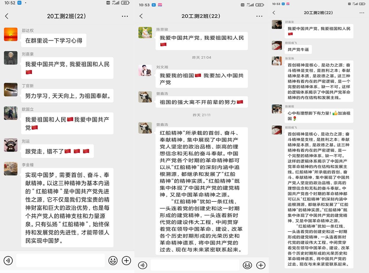 在本次宣讲结束后,2020级工程测量技术1、2、3班由团支书在本班微信群组织开展了讨论,同学们纷纷分享了自己的学习心得。