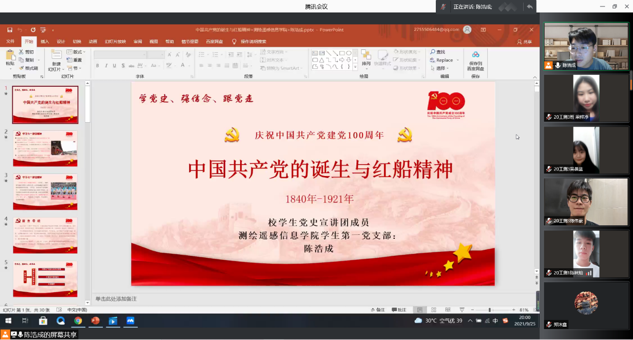 9月25日晚上,校学生党史宣讲团成员、测绘遥感信息学院学生第一党支部预备党员陈浩成面向测绘学院2020级工程测量技术专业1、2、3班学生开展线上党史宣讲。