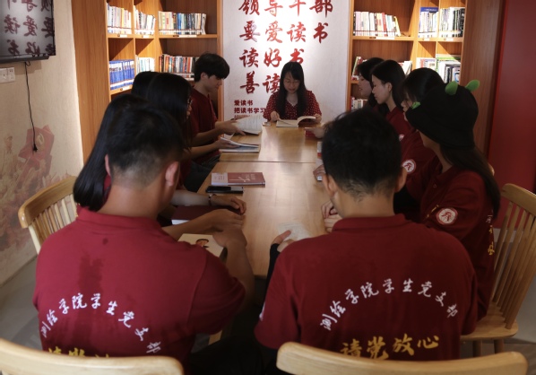 (党支部书记兼指导老师冯臻佳在八一村阅览室给服务队上专题党课)