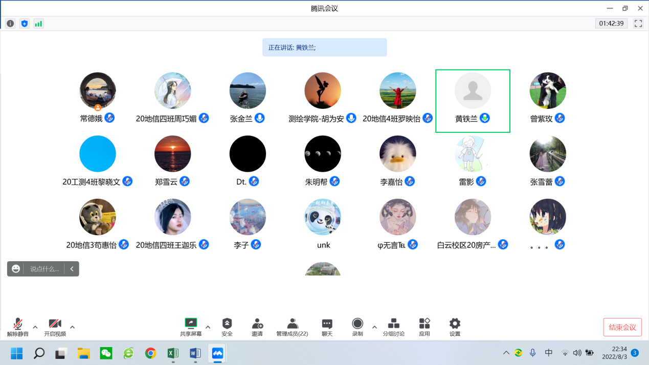 2022年8月3日晚上7时,测绘遥感信息学院通过腾讯会议在线举行2022年全国大学生GIS技能竞赛阶段性成果集中汇报与指导工作会议。本次会议由地理信息系组织,2022年GIS技能竞赛专项工作负责人常德娥老师主持。地理信息系主任黄铁兰、副主任朱腾,专任教师张金兰、申晨、吴露露、胡为安、张雪蕾、朱明帮,以及参赛学生团队成员共30余人参加了会议。会议分为2个阶段,历时近4个小时。