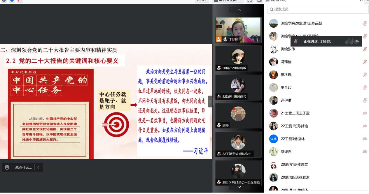 为深入学习贯彻党的二十大精神,12月15日晚,测绘遥感信息学院党总支邀请退休教师、原马克思主义学院副院长丁妙珍教授为学院师生开展了一场以“学习贯彻党的二十大精神——自信自强再创新高”为主题的党的二十大精神专题宣讲。测绘遥感信息学院党总支副书记李元主持了本次宣讲,150余名师生(党员、发展对象、入党积极分子)参加了本次宣讲。