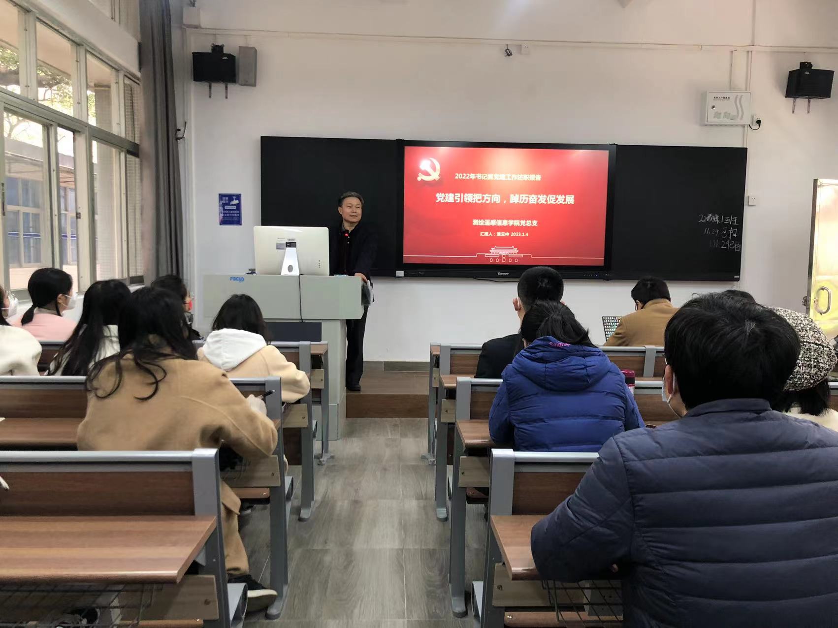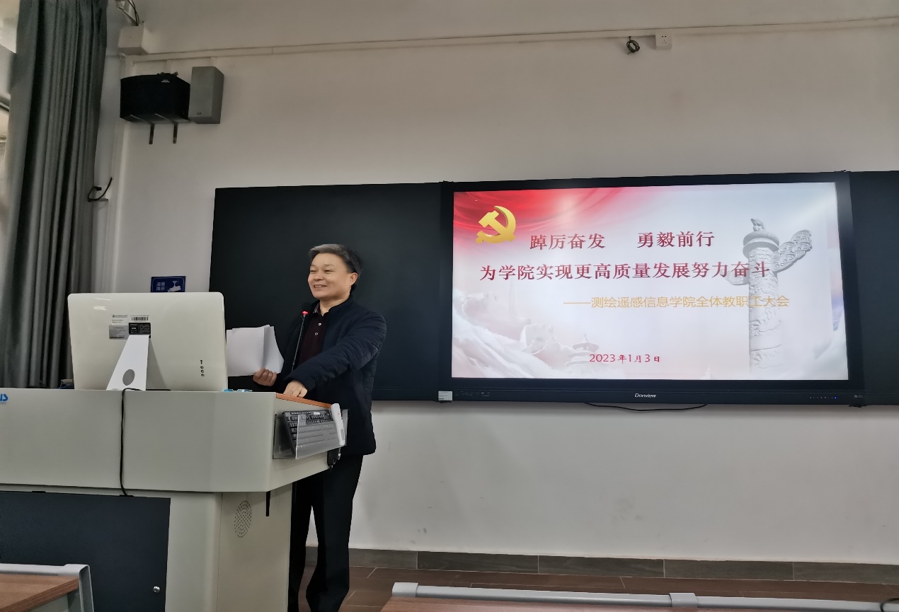 为持续深入学习贯彻党的二十大精神,学习领悟党中央、国务院《关于深化现代职业教育体系建设改革的意见》,切实把学习成果转化为奋进新征程、建功新时代的工作举措和实际成效,以实干实绩标准迎接学院 国家“双高”专业群建设的验收工作。1月3日,测绘遥感信息学院在天河校区东区教学楼103召开全体教职工政治学习会议暨年末工作总结会议,学院党总支书记兼院长速云中主持会议并组织政治学习,学院全体职工参加会议。会议主题是:踔厉奋发,勇毅前行,为学院实现更高质量发展努力奋斗。