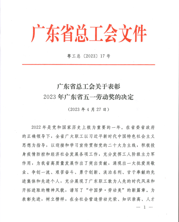 广东省总工会关于表彰2023年广东省五一劳动奖的决定