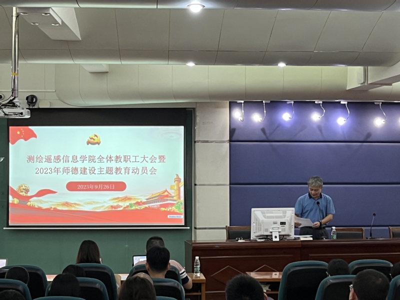 9月26日下午,测绘遥感信息学院在天河校区西区报告厅召开全体教职工政治理论学习暨新教师培训会议。会议由测绘学院党总支书记、院长速云中主持,测绘学院全体教职工参加会议。