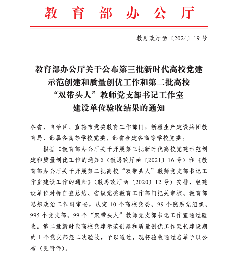 近日,教育部办公厅关于公布第三批新时代高校党建示范创建和质量创优工作和第二批高校“双带头人”教师党支部书记工作室建设单位验收结果的通知,测绘遥感信息学院教师第一党支部顺利通过第三批“全国党建工作样板支部”建设单位验收。