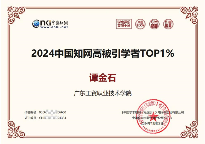 2024年12月29日,中国知网中国科学文献计量评价研究中心公布了“2024中国知网高被引学者”名单,我校测绘遥感信息学院教师谭金石副教授入选“测绘科学与技术”学科高被引学者TOP1%。测绘科学与技术学科123人入选本次名单,来自全国59个高校和科研机构,我校是其中唯一的高职院校。