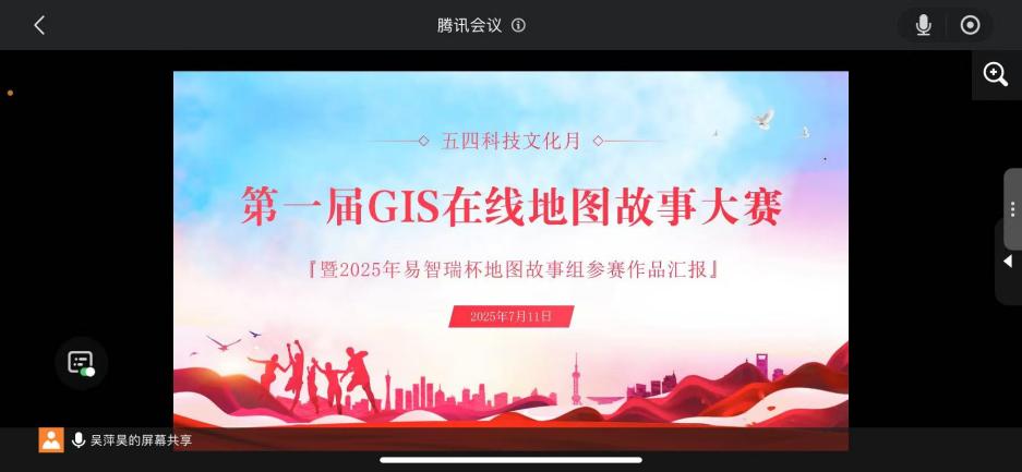 2025年7月11日晚,测绘学院第一届GIS在线地图故事大赛暨2025年易智瑞杯地图故事组参赛作品汇报活动正式在线上腾讯会议举行。测绘学院副院长黄铁兰,地信系主任朱腾、副主任吴萍昊,以及专任教师吴春华、吴军超,工测系副主任朱明帮、专任教师申晨与各参赛学生选手参加会议,共计20余人。