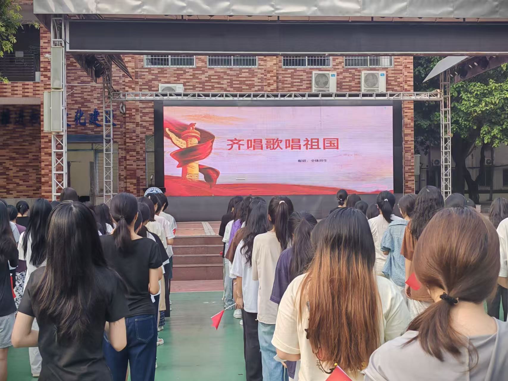 各校区师生挥舞小国旗,齐声高歌《歌唱祖国》