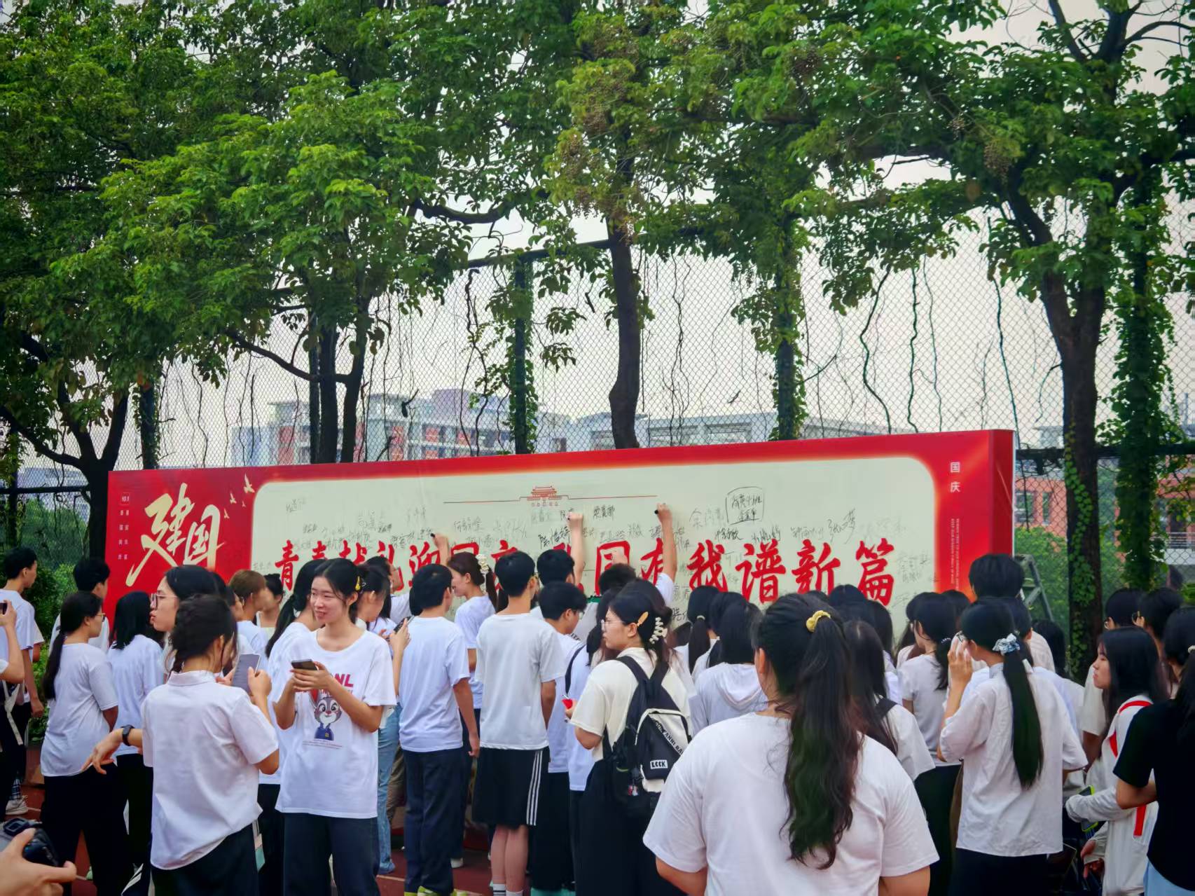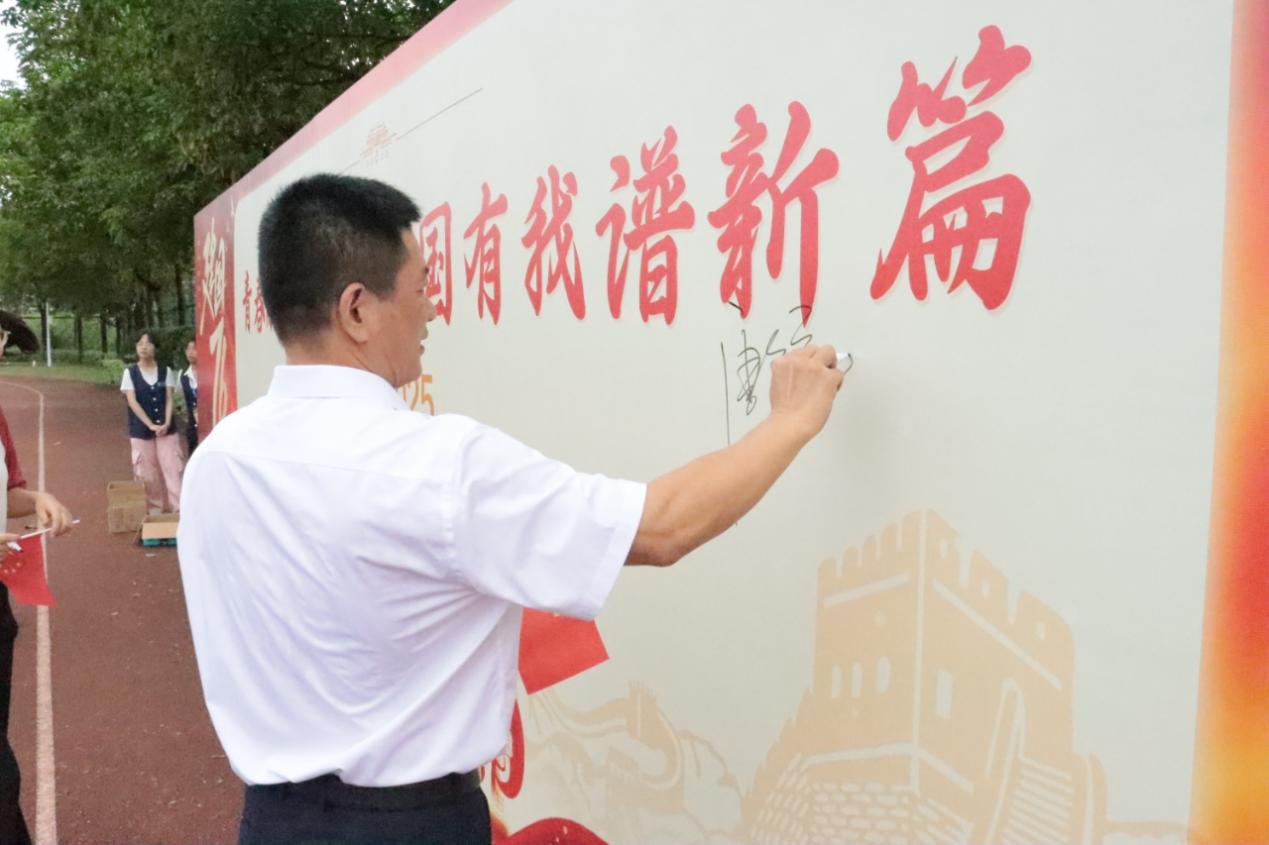 升旗仪式后,参会师生纷纷拿起手中的签字笔,在活动展板上留下了自己的名字及祝愿,一个个名字,一句句寄语,是工贸师生“青春献礼迎国庆,强国有我谱新篇”的庄重承诺。