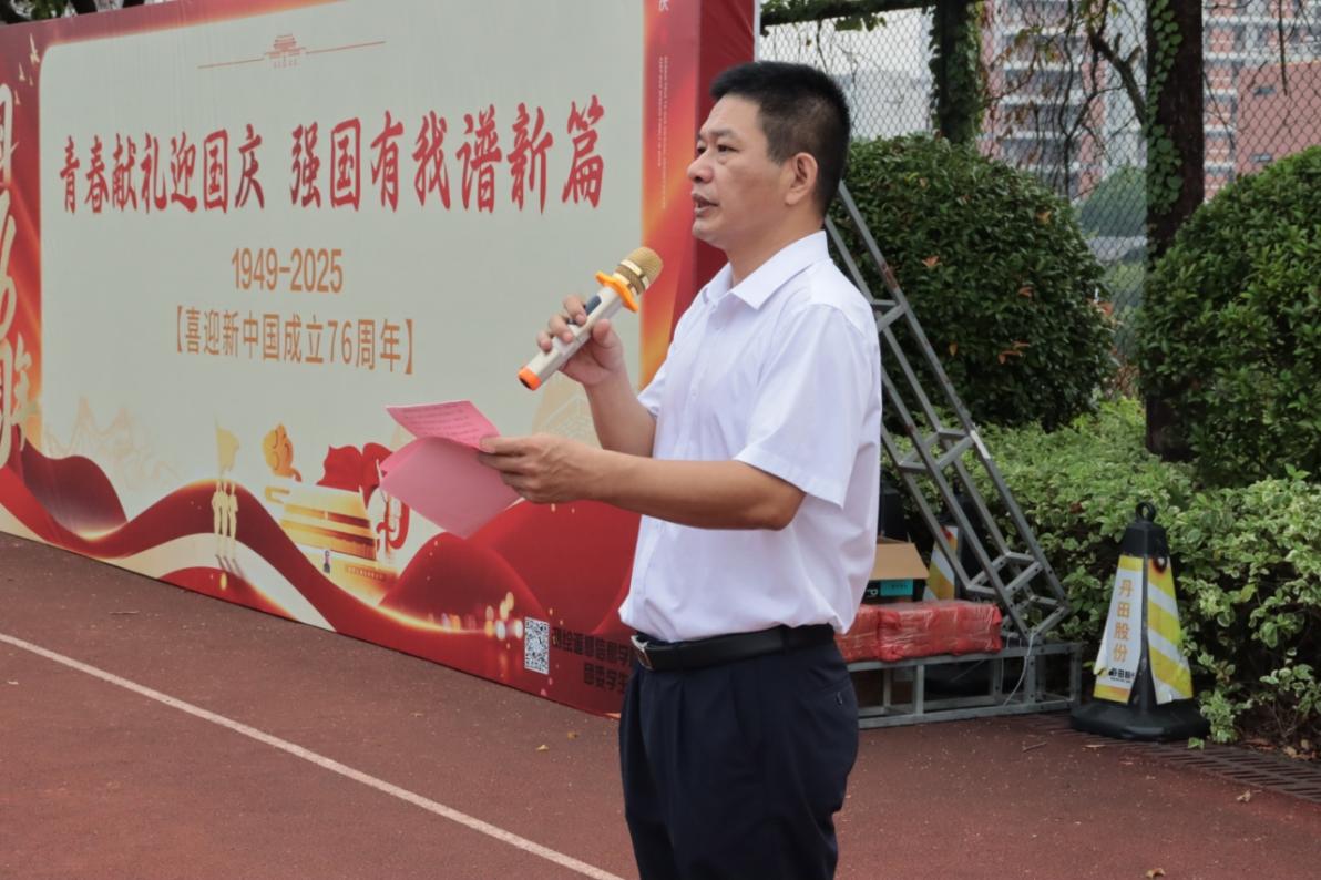 接下来,学校党委委员、副校长唐毓秋在国旗下发表了讲话,他指出新时代的青年生逢其时,重任在肩。国家的现代化建设和广东高质量发展,迫切需要大批高素质技术技能人才。勉励同学们将“强国有我”的誓言转化为实际行动,自觉培育和践行社会主义核心价值观,努力成长为担当民族复兴大任的时代新人。