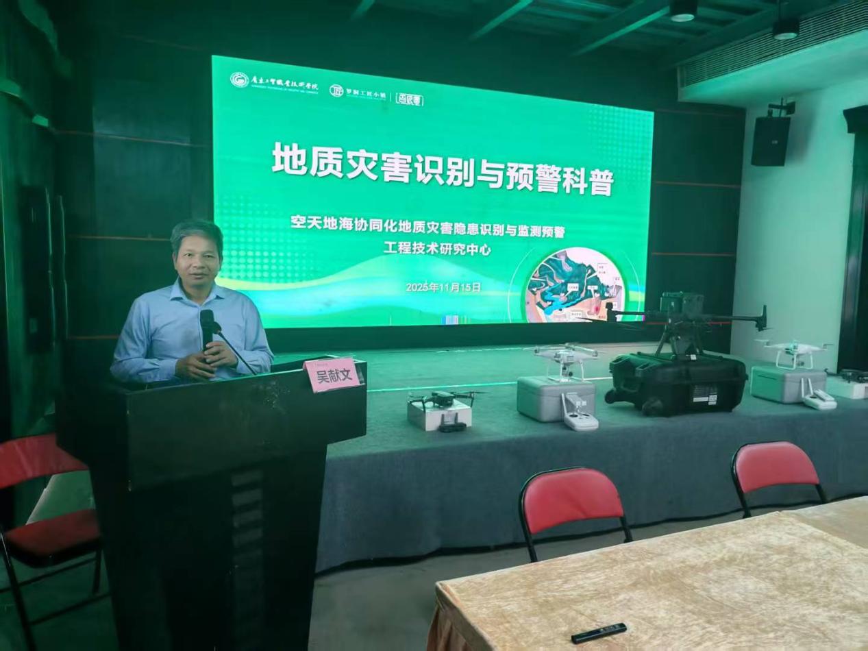 本次讲座特别邀请到太阳集团城官网1407空天地海协同化地质灾害隐患识别与监测预警工程技术研究中心吴献文教授担任主讲。讲座伊始,吴教授结合我国及本地区地质灾害多发的实际情况,通过详实的数据、典型的案例和视频,生动讲解了滑坡、泥石流、崩塌、地面塌陷等常见地质灾害的形成原因、分布特点及危害程度。针对山区、丘陵地带居民普遍关注的“如何快速识别地质灾害前兆”问题,吴教授重点拆解了裂缝变化、水体异常、动植物异动等关键预警信号,用“看、听、查”三字口诀帮助现场观众快速记忆——“看坡体是否开裂、看泉水是否变浑,听山体是否有异响、听树木是否有断裂声,查周边环境是否出现异常沉降”,通俗易懂的讲解让现场观众纷纷拿出手机记录要点。