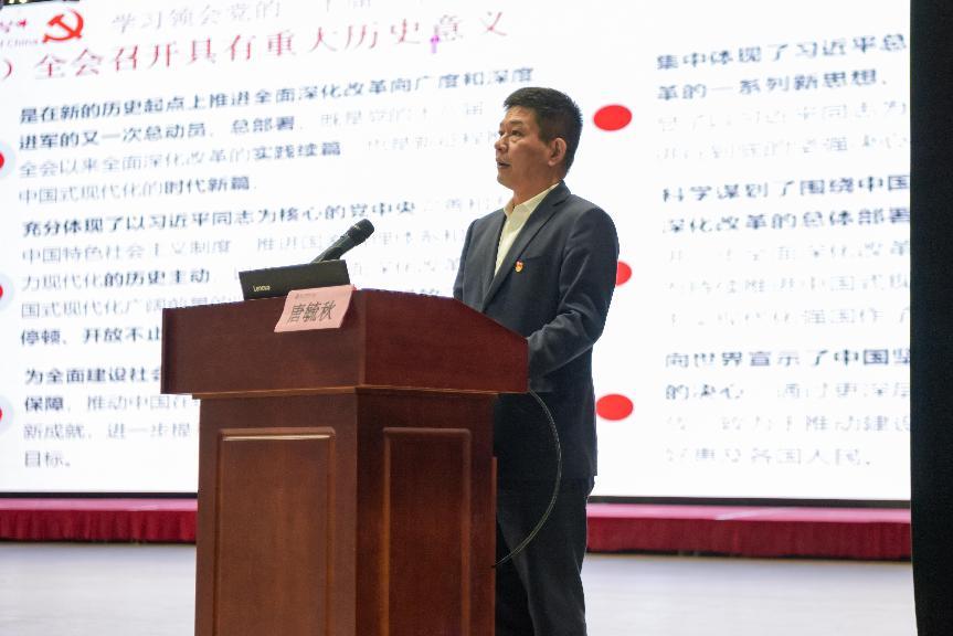唐毓秋以其深刻的见解与独到的视角,带领全体参会人员深入学习习近平总书记在党的二十届三中全会上的重要讲话精神,并对《决定》的重大意义进行了全面而细致的剖析。他指出,《决定》彰显了党中央在完善和发展中国特色社会主义制度、推进国家治理体系和治理能力现代化进程中的历史担当与坚定决心,为全面深化改革、开辟中国式现代化新道路指明了方向。
