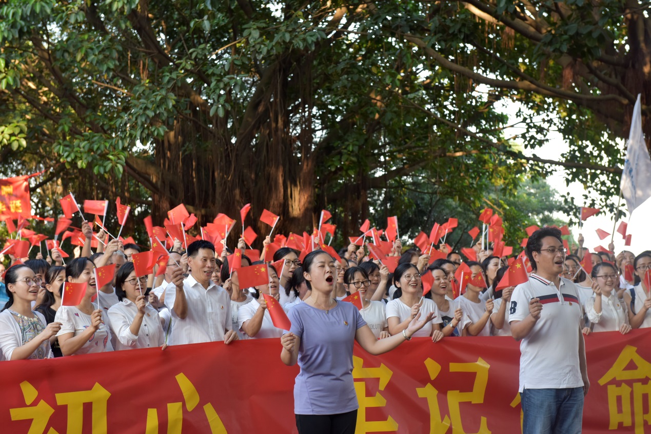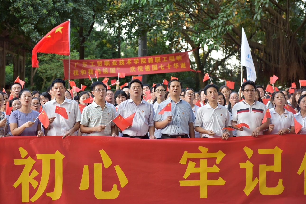 学校教职工500多人共同高唱《我和我的祖国》、《歌唱祖国》,歌声响彻白云山白云松涛,鲜艳的五星红旗在空中飘扬,呈现一片红色的海洋,表达了工贸人对祖国的一片深情厚意和对党的忠诚热爱,表达了对祖国美好的祝福,唱响了建设工贸美好未来的信心和决心,充分展现了工贸人朝气蓬勃、意气风发、团结奋进的精神风貌。